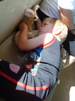 Relaxing and enjoying the ride with snuggle buddies, including a Kit Fox stuffed animal - Eli's souvenir from the Animal Ark (and now he wants a "souvenir" everywhere we go).