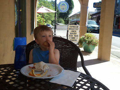 Otherwise, that night was by far our best night of sleep. I think it helped immensely that we each had our own bed, Elias taking the top bunk while I slept on the bottom. Even so, while he'd clearly been reacting to something in Nevada - the heat, the dry air, the smoke from nearby wildfires, the sage brush, or some crazy combination? - his congestion was suddenly mostly gone at the cabin and therefore his breathing at night - downright snoring at times - much quieter. After pre-breakfast, shown above, we headed into the little town of Groveland for a more substantial meal and picked up a couple of sandwiches from a deli on the way back to the cabin for lunch later that day.