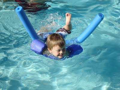 We spent most of that day together in the pool, where, with the assistance of a pool noodle and Hazel's "floaties" Elias was able to "swim" mostly unassisted. After a lukewarm session of six swim lessons back at home, he could not get enough of the pool here. After several hours in the pool, we convinced the kids to get cleaned up (during which Elias had a meltdown in the pool, not wanting to get out) in preparation for dinner in town (where he had yet another meltdown on the way - it was already after 7, after all). In spite of back-to-back meltdowns, however, Elias did pretty well the rest of the evening, even sitting and smiling for the adorable picture above.