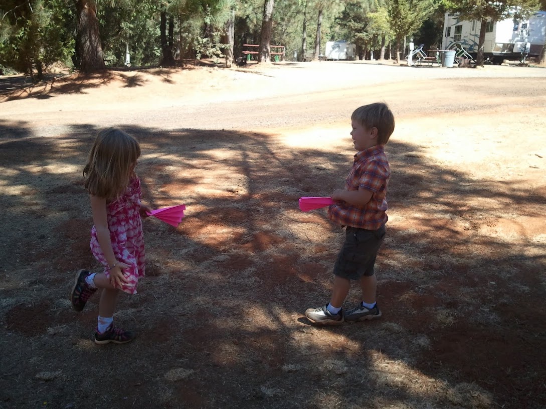 We then spent twenty bucks to drive through Yosemite. I was just thrilled they not only accepted but preferred credit cards at the toll booth, having completely spaced on getting cash before we left Winnemucca! Tioga Pass is indeed lovely but mostly lost on a tired 4 year old. And long. Man, I thought we'd never get through Yosemite. And then when we finally did we still had about 30 miles to Groveland, where we had reserved a small cabin for the last two nights of our trip at Yosemite Pines RV Resort. We didn't settle in to our cabin until almost 8 so dinner that night consisted of popsicles we bought at the little general store upon checking in. We were also a bit surprised to discover that our "basic" cabins didn't have private bathrooms, something that wasn't totally clear on the website (she even mentioned it - "Oh, did you reserve online? If you had called in we would have told you." What, no webmaster?). The communal bathrooms were a short walk from the cabin so in the end it wasn't a huge deal but not totally ideal, especially since I almost always wake up at night to go to the bathroom. Somehow I didn't need to the two nights we were there but it was a mad dash each morning once Elias was up. It was also tricky taking a shower, since Elias didn't want to come in with me, but I didn't feel comfortable leaving him alone in the cabin, either. Instead, that first night, desperate for a shower after a long, dusty drive, he wandered the bathroom, violating the privacy of probably everyone who happened to come in during that time, including two German girls who, well, didn't seem to care much.