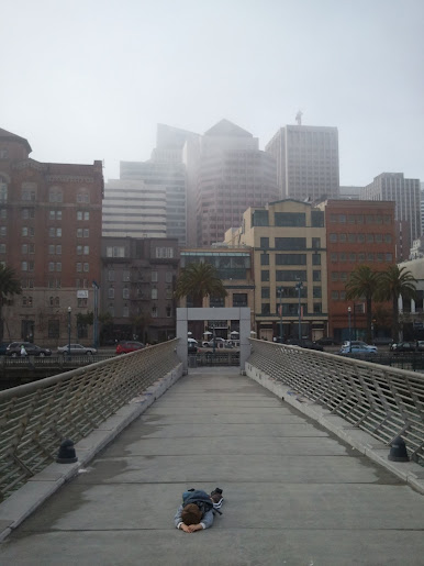 Here he is waiting for the ferry at Oakland's Jack London Square. I'm trying to remember just what he packed in his backpack...